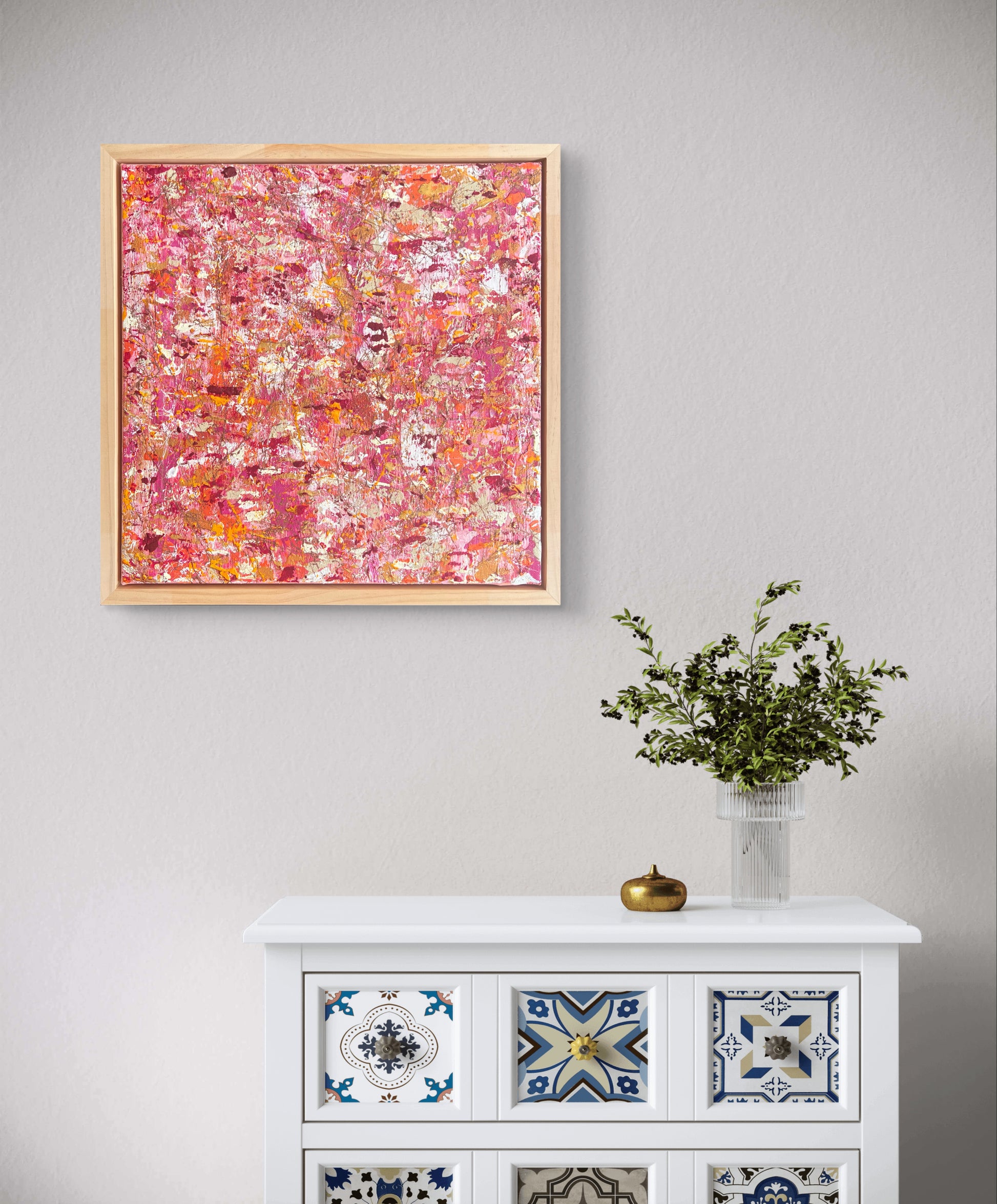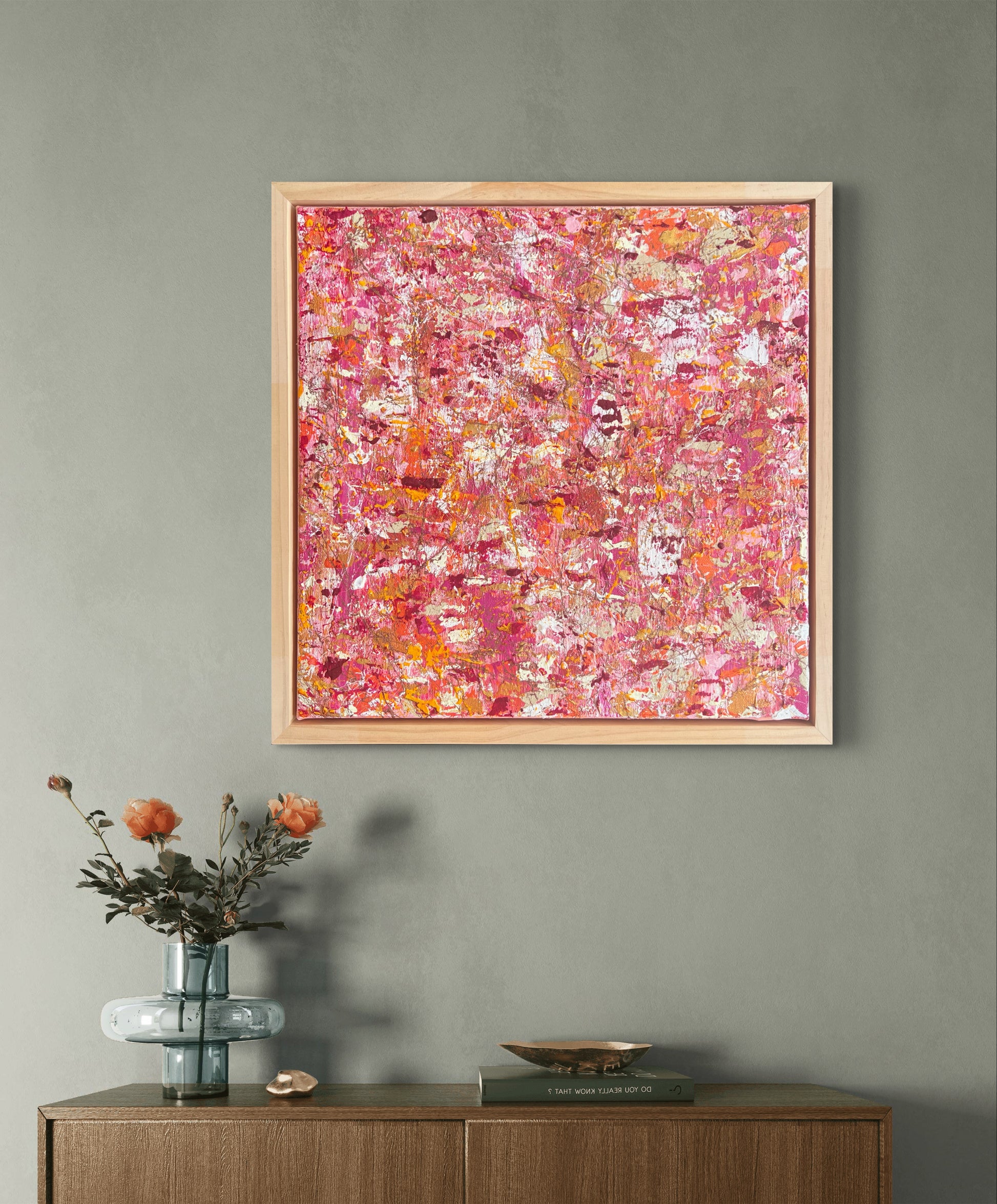 Framed in a natural wood floater frame (as per picture) and ready to hang with D-rings and wire.