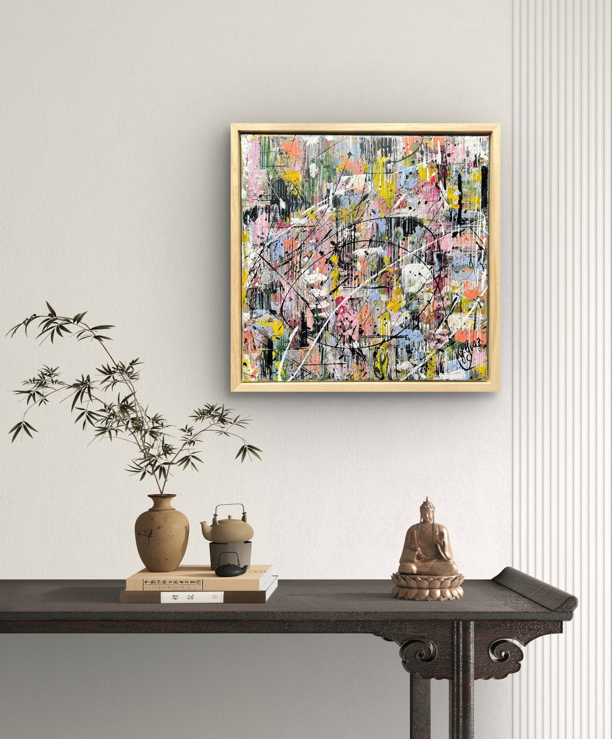 Framed in a natural wood floater frame (as per picture), ready to hang with D-rings and wire.