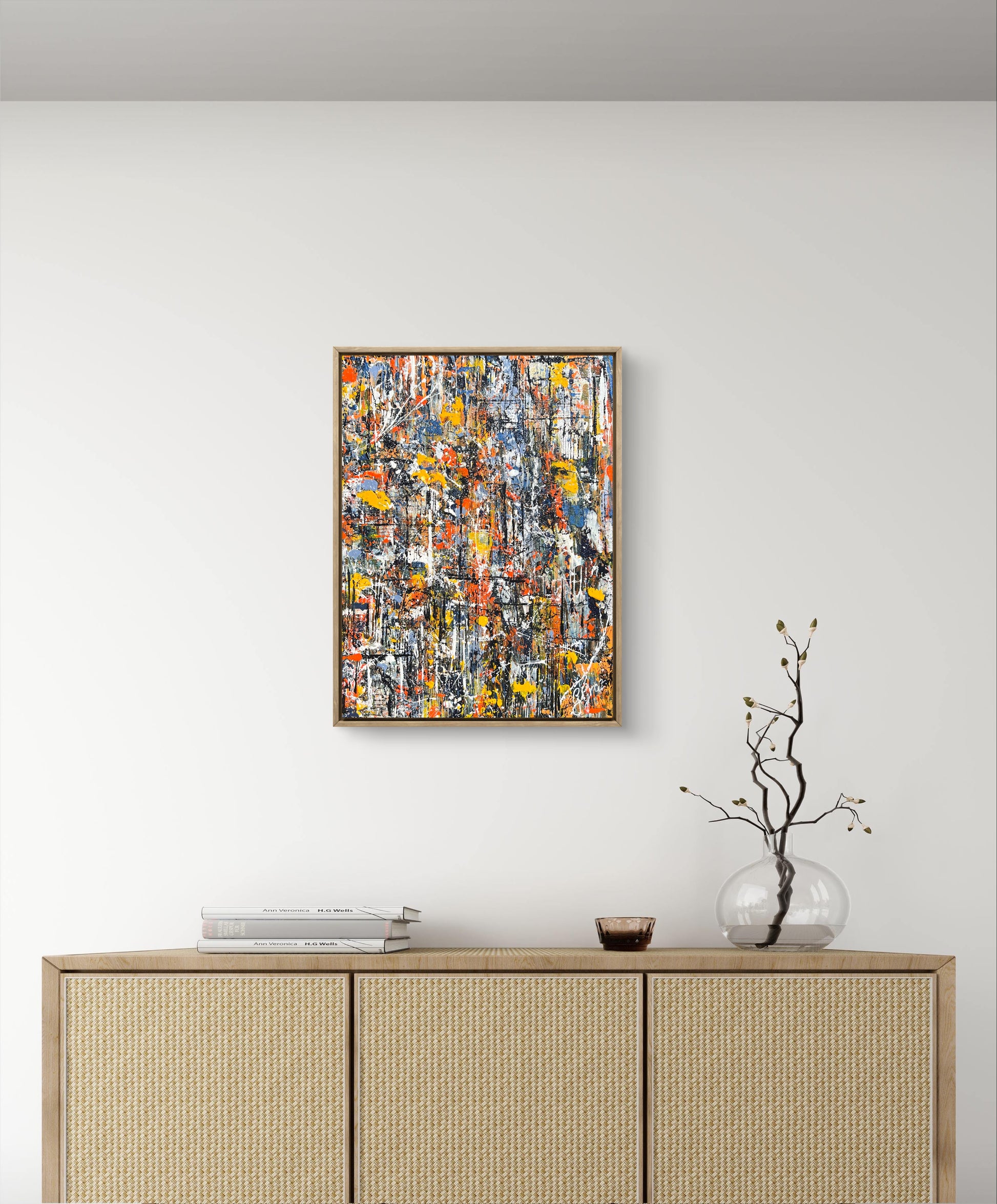 This painting continues seamlessly around all edges, giving the piece a fully finished look.